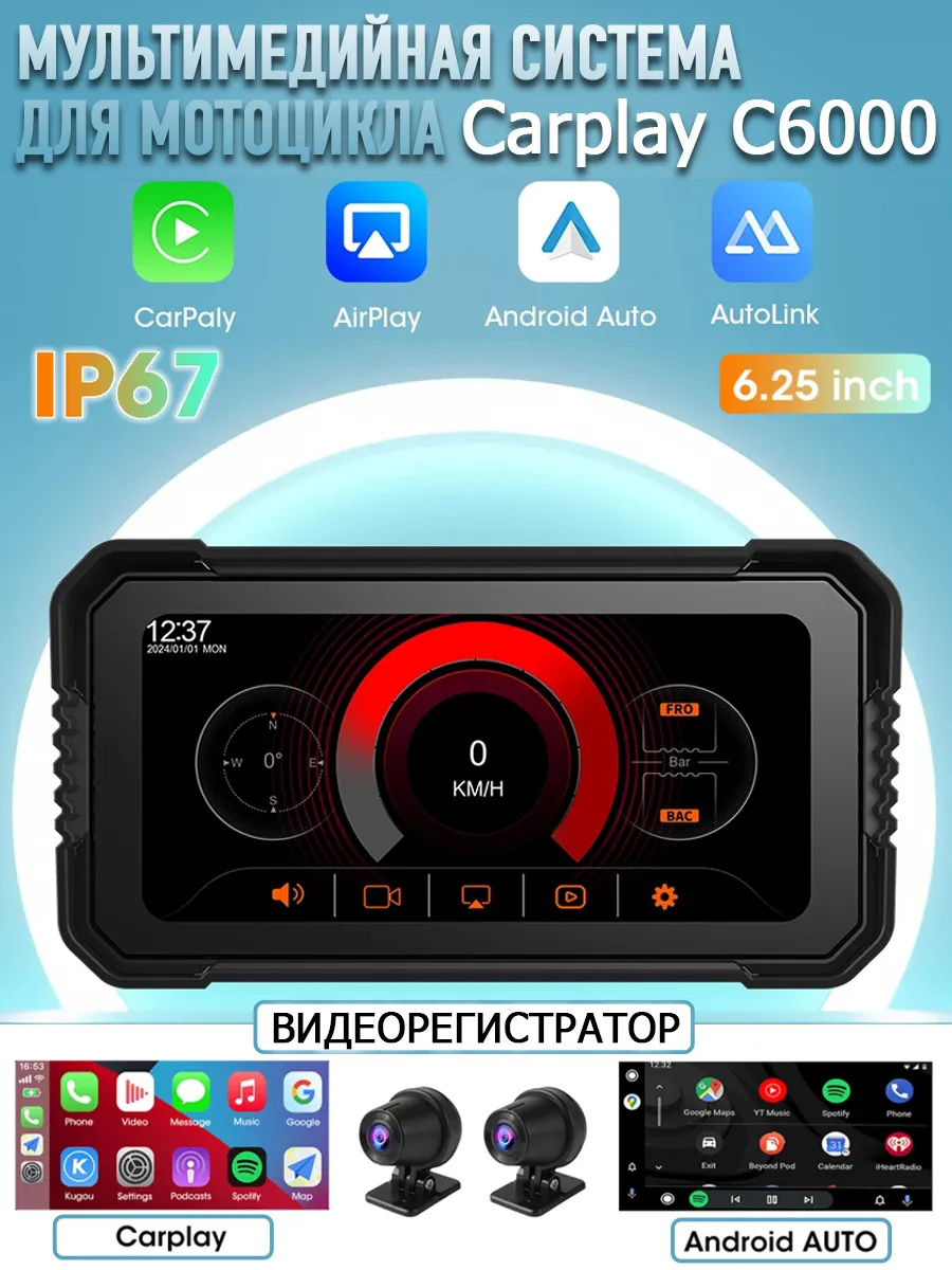 Мультимедийная система для мотоцикла Carplay / Android Auto C6000 DVR с видеорегистратором - Современное решение для интеграции смартфона в систему управления мотоциклом. 6,25-дюймовый защищенный IPS дисплей с сенсорным управлением и беспроводной связью позволяет использовать все возможности вашего телефона.