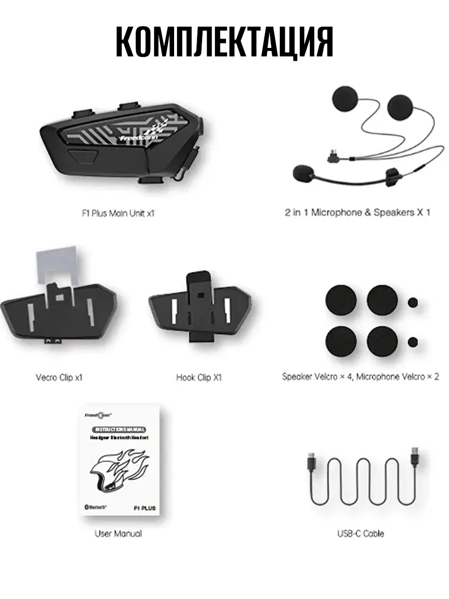 Мотогарнитура Freedconn F1 Plus , наушники, микрофон (жесткое крепление), набор креплений, USB кабель